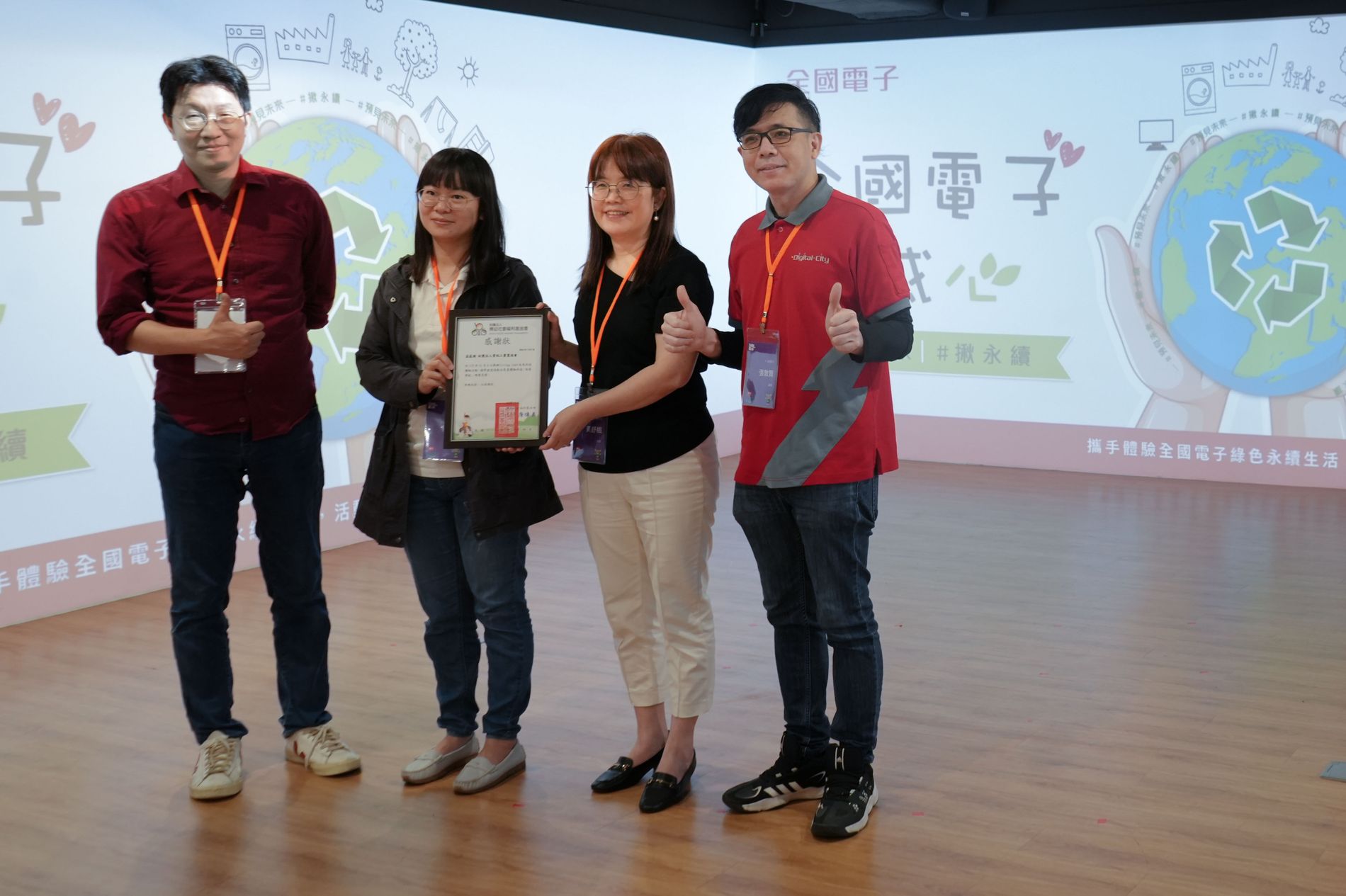資策會「再生電腦捐贈計畫」邁向第5年,由博幼基金會代表致贈感謝狀予資策會及全國電子。圖為會後合影,左起為:資策會數轉院副主任徐毓良、博幼基金會主任陳育禎、資策會數轉院主任黃舒楓、全國電子副理張敦賢。