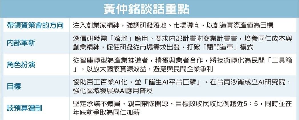 資策會董事長黃仲銘上任後積極推動轉型,以「革新與前瞻」為主軸,將資策會定位為協助台灣百工百業AI化領航者,並力圖催生台灣平台巨擘。