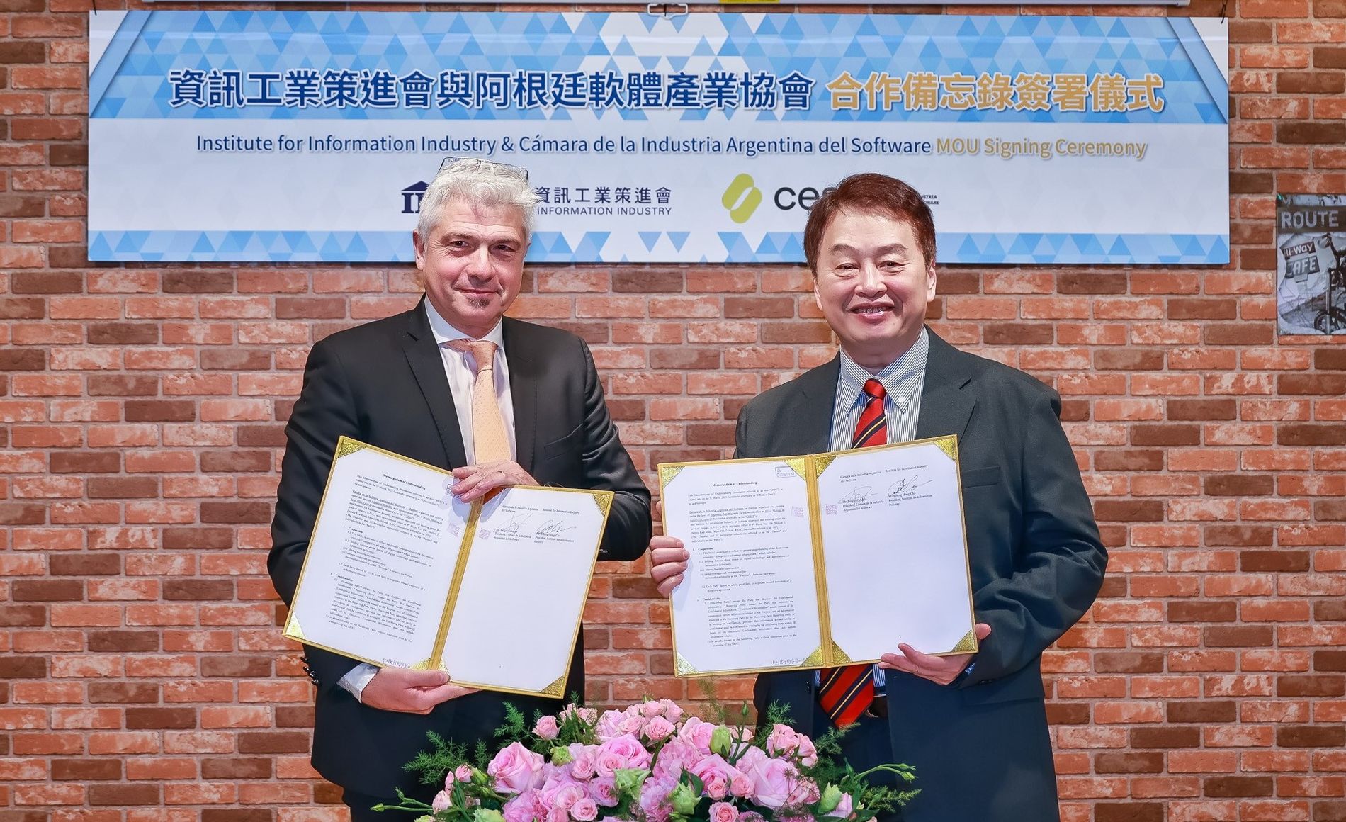 財團法人資訊工業策進會(資策會)今(31)日與從阿根廷遠道而來的阿根廷軟體產業協會(Cámara de la Industria Argentina del Software , CESSI*註)Sergio Candelo會長會面,執行長卓政宏親自接待,雙方並簽署合作備忘錄,為數位轉型交流開啟新局,外交部總領事陳昆甫、經濟部國貿局專員柯孟君特地蒞臨現場觀禮。