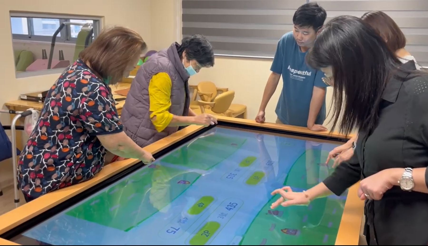 「TAKA憶萬富翁多人互動桌」以互動遊戲進行認知訓練,是款專門針對失智症做為輔助訓練的專業性產品,由資策會數轉院綜合考量日照場域空間動線與活動設計,結合樂齡智造科技設計的個人化、可量化、可追蹤的認知訓練方案,再搭載群創光電開發的85吋4K強化玻璃多點觸控互動桌,可同時6人互動,有助於提升長者的認知訓練效果與社交參與度;目前已導入秀傳醫療體系秀和苑日間照顧中心,獲得照服員與長者高度肯定。