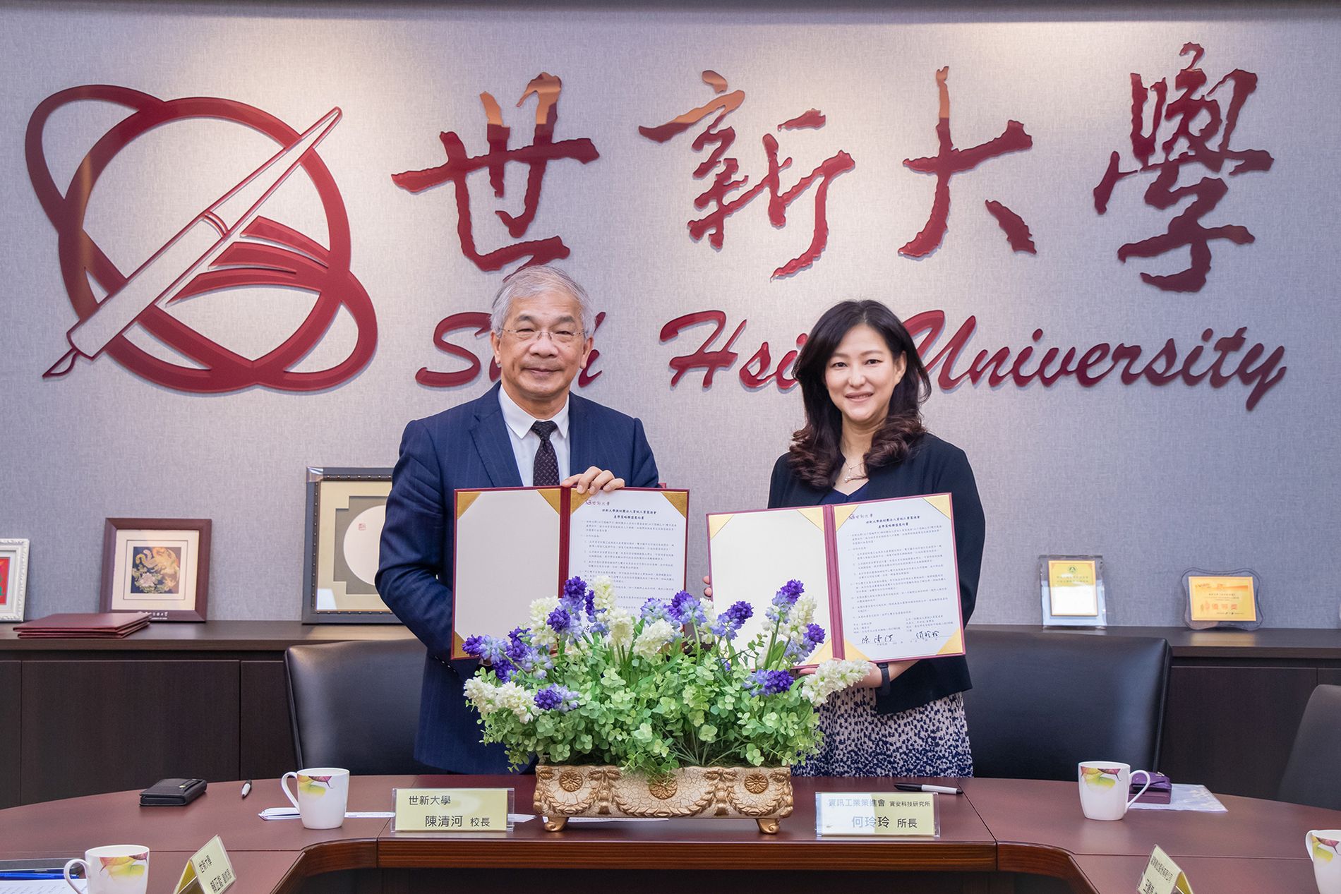 今日在世新大學校長陳清河、副校長賴正能、圖書資訊處圖資長張舜傑、產學合作長許碧芳、瑞擎數位總經理王騰嶽、資深產品經理賴家民、資策會資安所所長何玲玲、智慧雲端中心主任魏得恩等人出席見證下,完成備忘錄簽署。