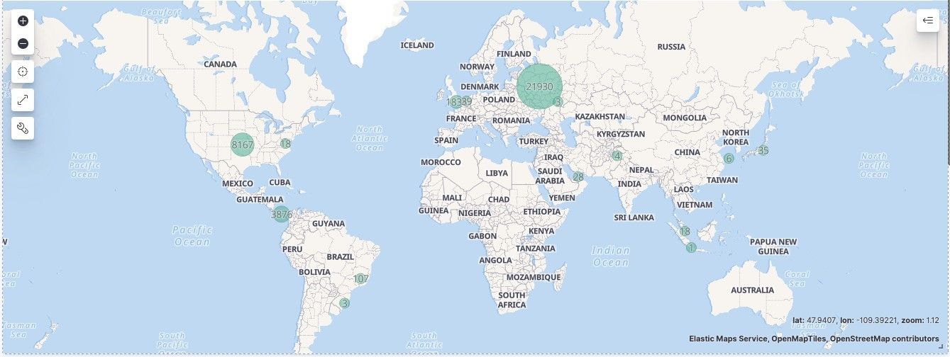 此外,在校內學生對外連線觸發的23個惡意IP中,戰情平台亦協助盤點連線觸發地區,並加強對學生進行資訊安全認知宣導,避免學校機敏資訊遭到有意或無意的存取,有了明確的來源,系統內世界地圖形式顯示圓點越大則事件次數越多,反之亦然。