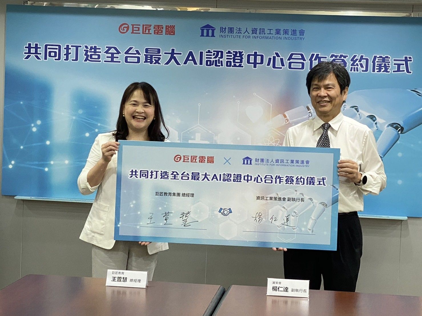 資策會近年積極投入生成式AI應用技術研發,並整合教育、產業等多方資源,領先全國發展出具標準化評量機制的「生成式AI能力認證」。目前已與全臺超過40所大專校院展開合作,推廣AI素養教育。此次攜手全國擁有廣泛據點的巨匠電腦,將AI學習資源擴大至社會人士,實現「學用接軌」、「即學即證」的全民AI新學習生態系,讓AI技能學習不再遙不可及。