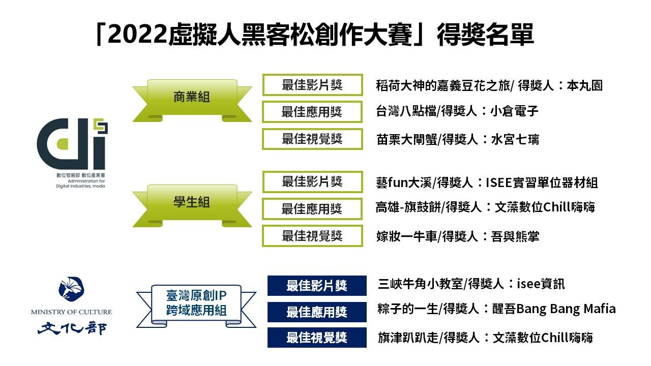 頒奬典禮於今(12)日在台北資訊月數位發展部主題館盛大舉行,與雲際線工作室、波塔學院、比爾數位科技等VTuber團隊合作現場直播,也由文化部邀請到榮獲第12屆金漫獎小島老師的《獅子藏匿的書屋》主要角色、前任棋王「元冬季」及獅子VTuber參與互動;在技術呈現上,則由資策會輔導並榮獲金鐘奬「創新研發應用獎」的團隊提供技術支援,利用動作捕捉設備及3D建模,將2D平面的肖像化成互動式的虛擬人VTuber介紹臺灣在地名產,展現數位創新科技。