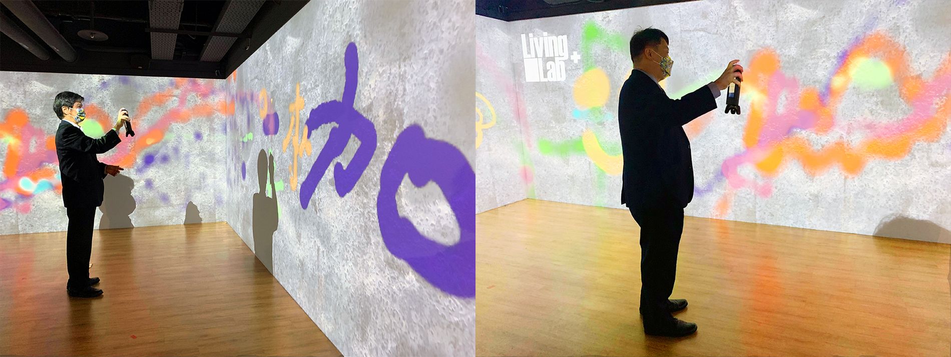 Living Lab+開幕活動現場生動活潑,安排機器人迎賓、清消機器人協助維持環境消毒,並運用互動虛擬動物「猴子熊」開場,啟動儀式安排有趣的互動橋段,讓現場嘉賓運用搖動手機方式點燃啟動畫面空間,掀起活動的最高潮。現場也透過動作感測進行數位塗鴉,讓參與貴賓體驗互動科技帶來的全新體驗。