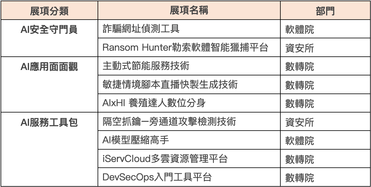 資策會於2023年III Plus系列活動中,除規劃一系列論壇研討之外,更在8月1日(二)的主論壇活動中,展示關於AI工具、技術應用及資安層面的技術,希望能夠讓現場的與會者體驗AI提供多元的應用及服務。展示項目列表: