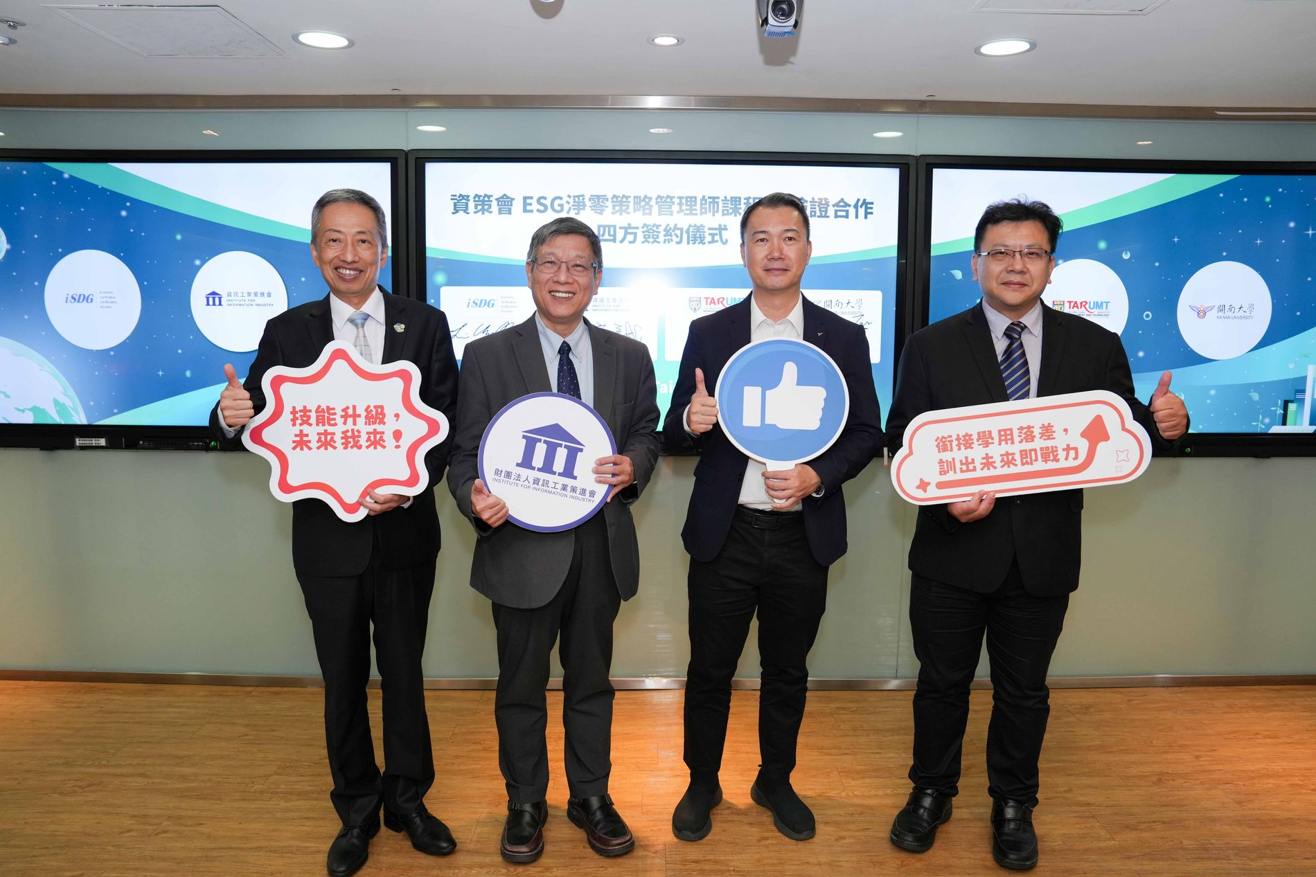 面對全球ESG浪潮與綠色供應鏈的嚴峻挑戰,企業對專業永續人才的需求日益迫切,為建構國際級的永續人才生態系,財團法人資訊工業策進會(資策會)今(5)日宣布,攜手愛思居國際驗證公司(愛思居)、馬來西亞東姑阿都拉曼管理及工藝大學(拉曼理工大學)、臺灣開南大學舉行四方簽約儀式,共同推動「ESG淨零策略管理師」專業課程培訓與人才驗證機制,未來將透過此一跨國驗證體系,協助臺商企業精準培育上下游供應鏈所需人才,強化其在全球綠色供應鏈中的競爭力。