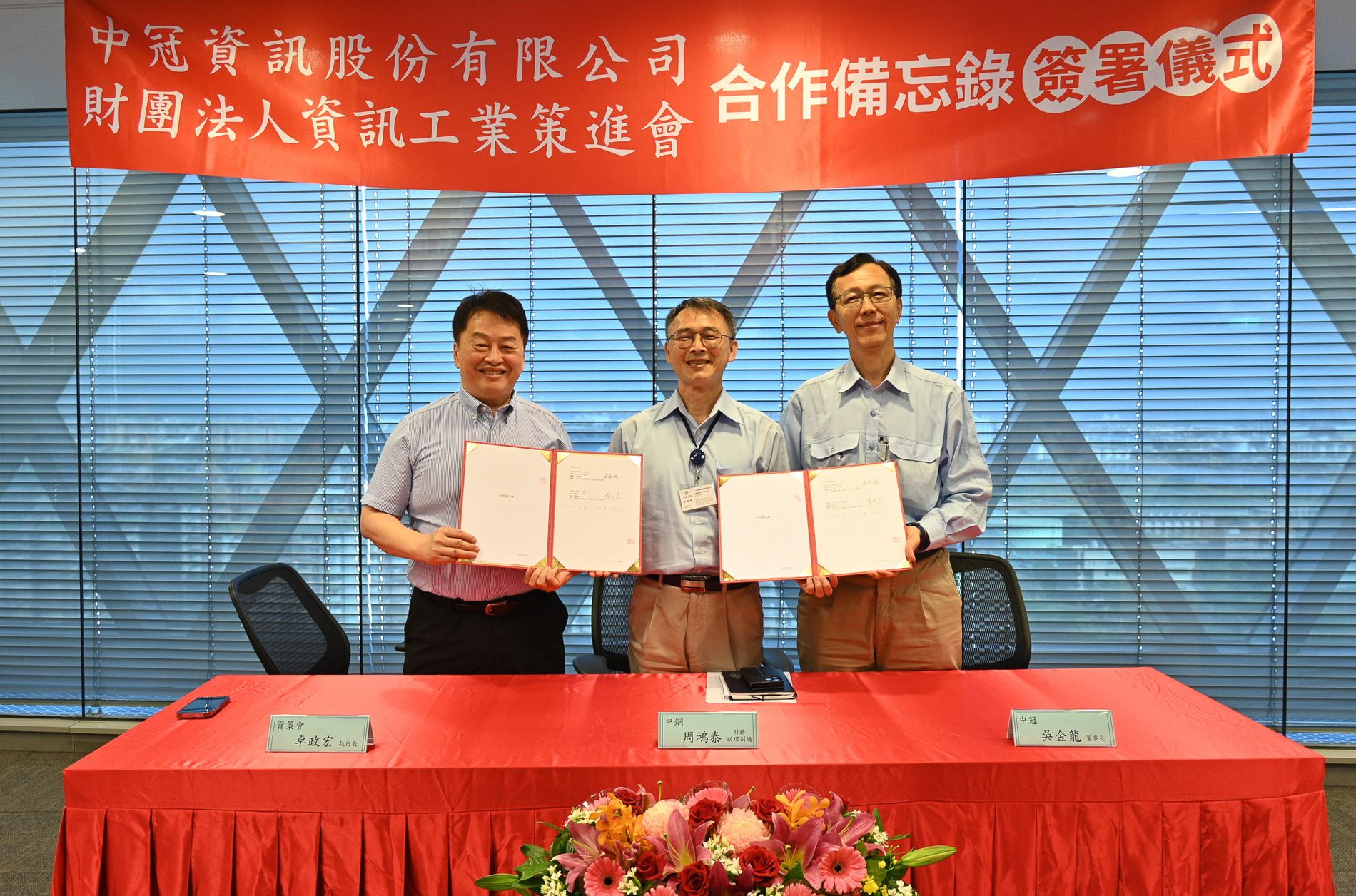 今(9)日在中鋼財務助理副總周鴻泰(中)的見證下,由資策會執行長卓政宏(左)與中冠資訊董事長吳金龍(右)代表雙方簽訂「資安即服務生態研發合作備忘錄」。